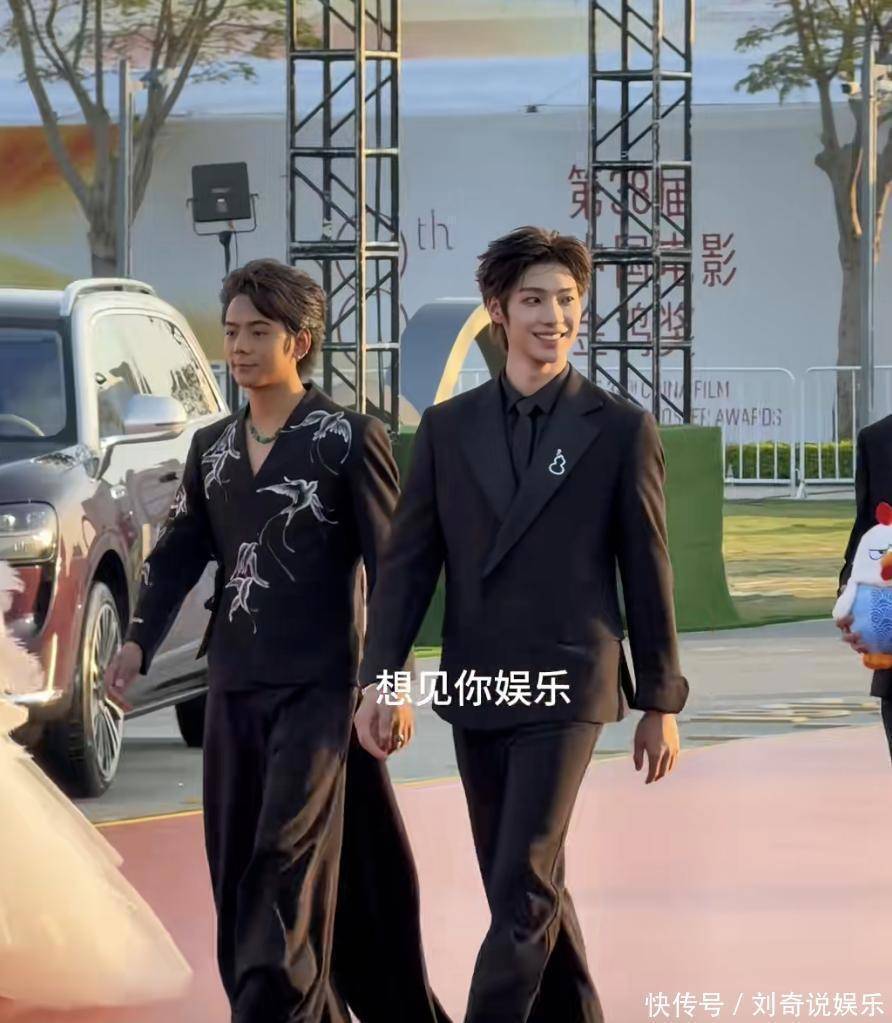 下午学员们都走上了金鸡闭幕式的红毯,丁真换了件印有春燕图案的国风礼服,衣摆拖着长长的尾巴,和飘扬的发丝一起形成了呼应。身高本来就不算高,礼服的花哨设计一衬,更让他显得瘦小。跟他一起走的颜安,在《九重紫》里被说成丑男,可站在丁真旁边,却显得眉清目秀。